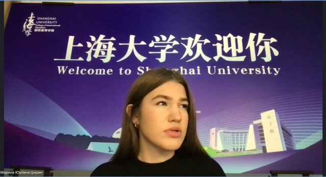 14 грудня 2022 року відбулася онлайн-зустріч зі студенткою ІІІ курсу Факультету східних мов, освітньої програми «Мова і література (китайська)» Мариною Цирин, яка проходить стажування за програмою академічної мобільності в Шанхайському Університеті (上海大学) - одному з кращих університетів Китаю. У дружній ранковій атмосфері, Марина розповіла студентам-китаєзнавцям, якими є актуальні можливості участі в грантових програмах у заклади вищої освіти Китаю, поділилася враженнями від навчання за кордоном та власним досвідом адаптації в іншомовному середовищі.
